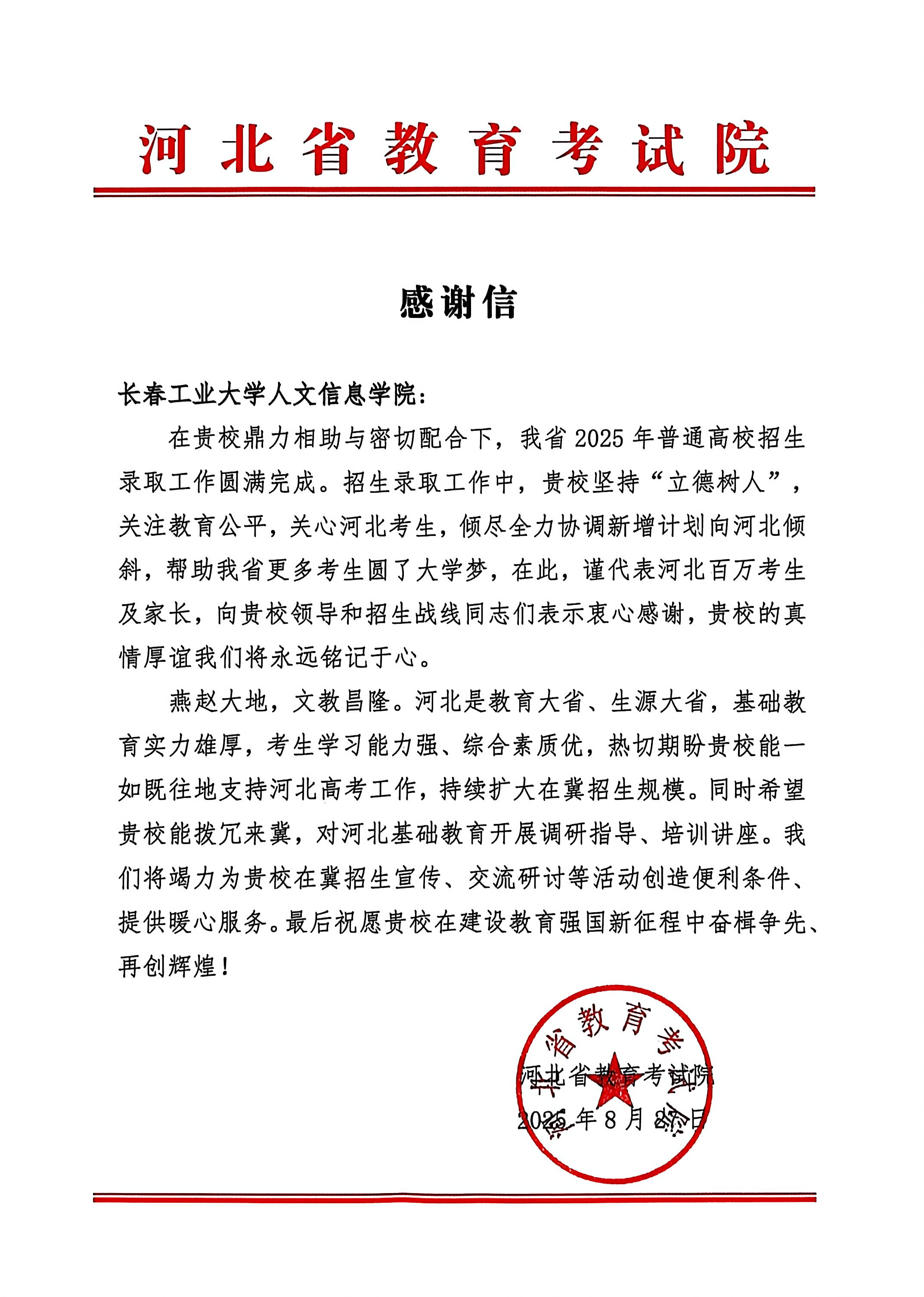 近日,河北省教育考试院发来感谢信,对我校在2025年普通高校招生录取工作中的支持表示衷心感谢!